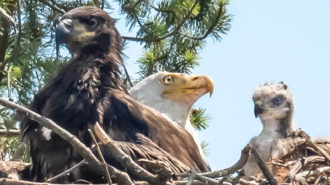 Header Image: A pair of bald eagles are raising a red-tailed hawk into their nest. Credit: Sharon (takingtimephotography.com)/Growls via Facebook