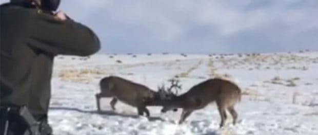 Header Image: Alberta Fish and Wildlife Sgt. Scott Kallweit took a steady shot two separate two deer that had locked antlers. ©Shirley and Russ Wright video via CBC Instagram