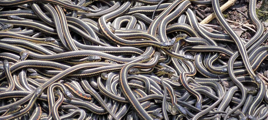 Thousands of tourists come out to a small town in Manitoba every year to witness garter snakes emerge from hibernation. But while the human crowds can be large, they pale in comparison to the roughly 70,000 red-sided garter snakes (Thamnophis sirtalis parietalis) which emerge from their underground hibernation dens in huge, writhing masses. These snakes call the area around the town of Narcisse home partly due to underground limestone caverns that give the reptiles a warm place to weather the harsh prairie winter 65 miles north of Winnipeg — already one of North America’s coldest major cities. After such a cold winter, the snakes emerge, seeking bodily warmth. They try to mate as soon as they can upon waking up.
