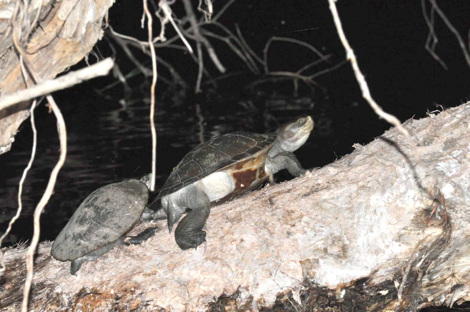 Nocturnal basking has only recently been reported in wild freshwater turtles, but a recent study found the behavior is widespread and occurs in many species. For the study, published in Global Ecology and Conservation, a team of researchers from around the world put cameras on basking logs to monitor the nocturnal activity of as many freshwater turtle species as possible. Cameras taking one photo every two minutes were set up in 25 locations across Australia, Belize, Germany, India, Seychelles, Senegal, Trinidad and Tobago, the U.S. and South Africa. The cameras captured data on 29 species from seven of the freshwater turtle families. The behavior is widespread among turtle families, said lead author Donald McKnight, a postdoctoral researcher at Australia’s La Trobe University, but it only occurs in the tropics and subtropics. “We think it’s related to temperature,” he said. “The water is staying so warm at night that it’s actually warmer than the turtles like to be, and they can cool down by coming out of the water.”