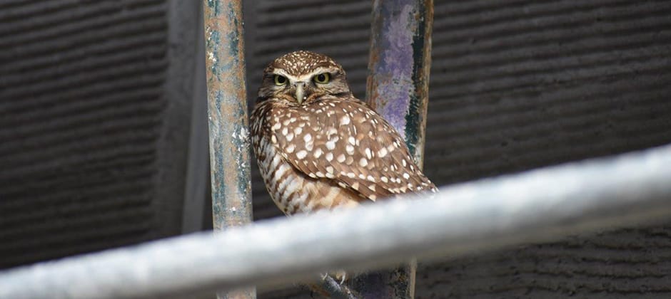 I would find the owl perching on either the scaffolding or an adjacent palm tree—but I did not see any nearby burrows, open pipes or other feature that it could have used for cover. The construction foreman commented that the owl typically relocated to a nearby perch if the crew got within 10 feet. The owl seemed to favor the location and perhaps it was a good place to take shelter from the intense storms that it weathered during its stay.