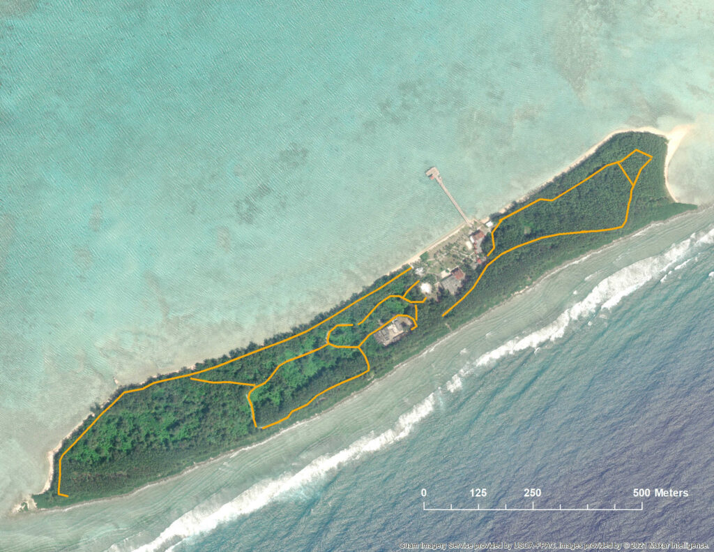 In October 2020, a new population of invasive brown treesnakes was discovered on Cocos Island, a 33-hectare island located about 2.5 kilometers off the south coast of Guam. Cocos Island is a refuge for many lizards and birds, including endangered species, which were extirpated from mainland Guam by invasive predators including brown treesnakes (Boiga irregularis). Several tools and techniques, including baiting and trapping, have been developed and continue to be improved for managing invasive brown treesnakes on mainland Guam.