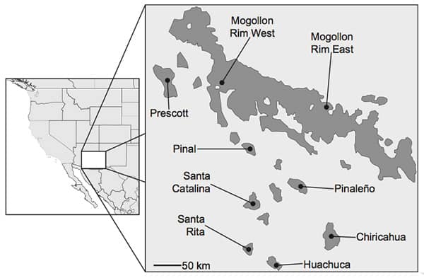 The researchers took genetic samples from a few individual nuthatches on different sky islands in Arizona near the transition of the southern Rocky Mountains and the north of the Sierra Madre Occidental. The forested areas differed in that some were predominantly made up of pine, and others had more oak trees. The sky islands sampled were separated by distances of between five and 50 kilometers of desert.