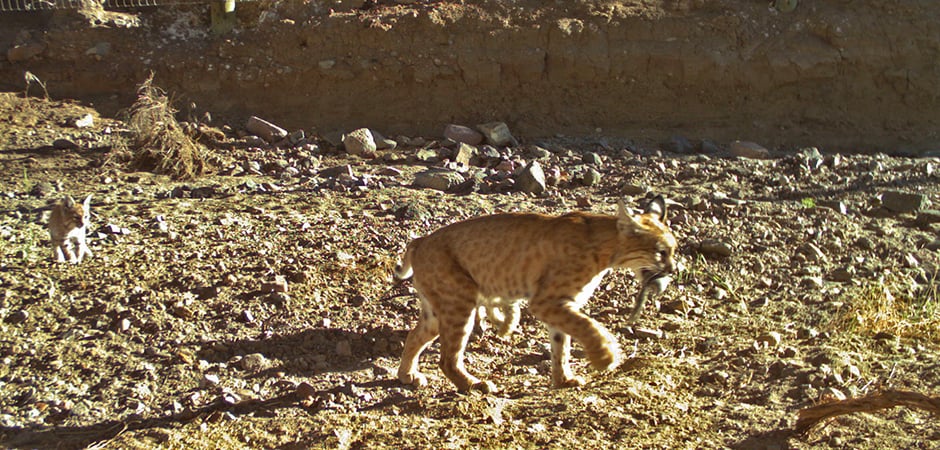 Bobcats (Lynx rufus) were also found with their mouths full on camera, such as in this shot. Other images show bobcats carrying hares and possibly other prey. Lagomorphs and other small prey may use the bushes as shelter, Caldwell said, though it doesn’t appear always to work out in their favor.