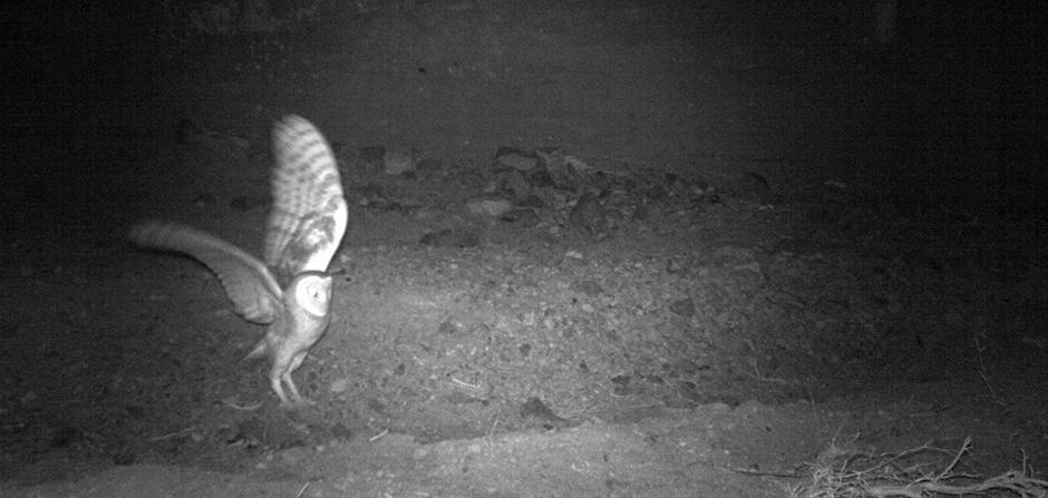 Aside from land-based predators, a barn owl (Tyto alba) apparently nested above one of the camera traps and is possibly hunting in this shot, although researchers say they don’t have enough data to show a trend of owls using the underpasses.