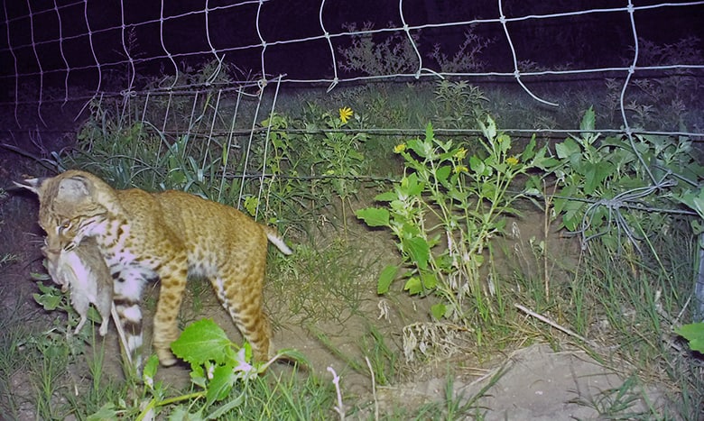 Bobcats (Lynx rufus), such as this one with freshly caught prey in its mouth, also make use of them. The cameras also captured peccary (Tayassu tajacu), coyotes (Canis latrans) and badgers (Taxidea taxus).