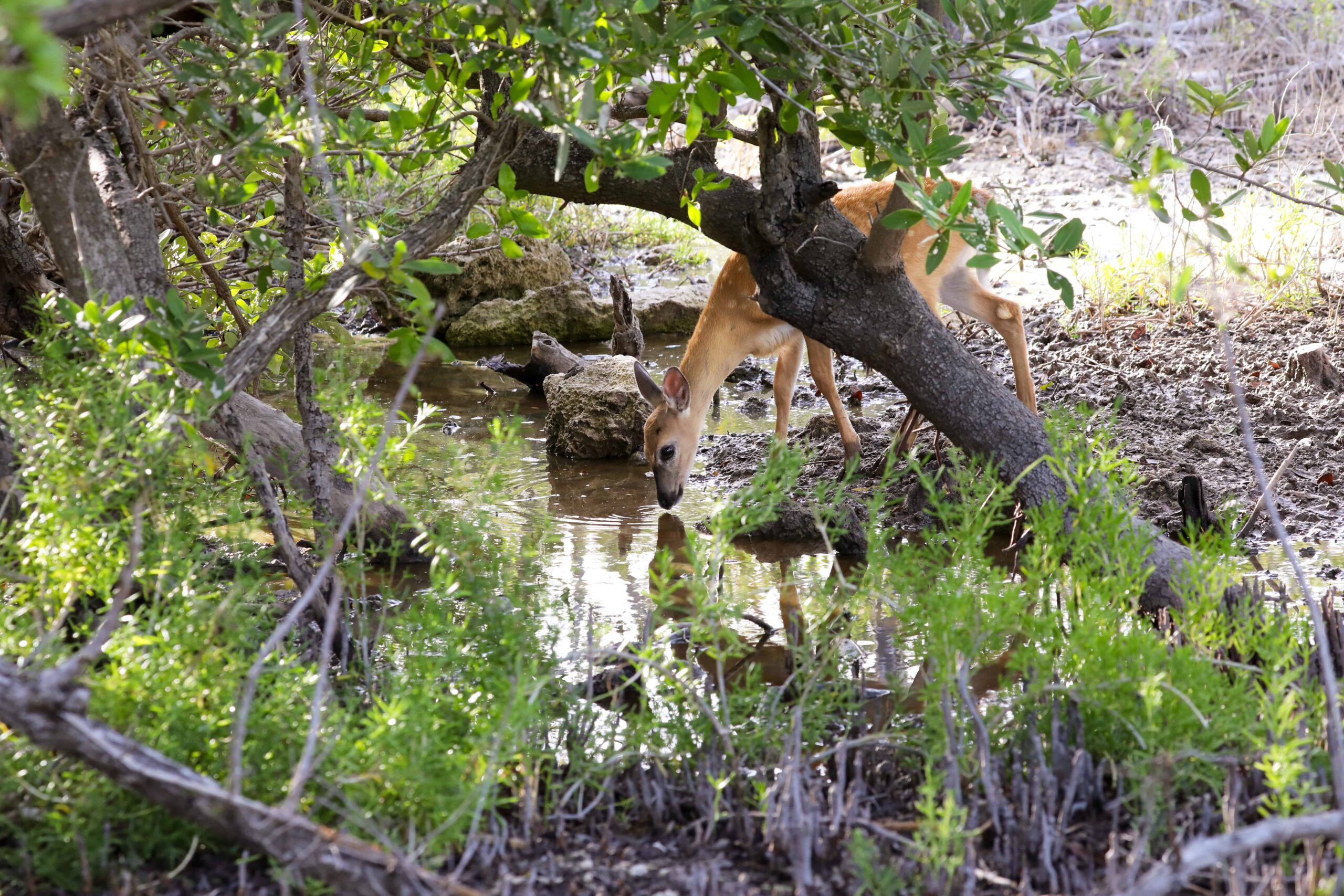 Key deer, the smallest deer species native to North America, primarily feed on red mangroves that grow in the Keys. The U.S. Fish and Wildlife Service considers the ungulates endangered due to the loss of habitat from development, domestication from humans feeding them, and changes to the fire regime in the area.
