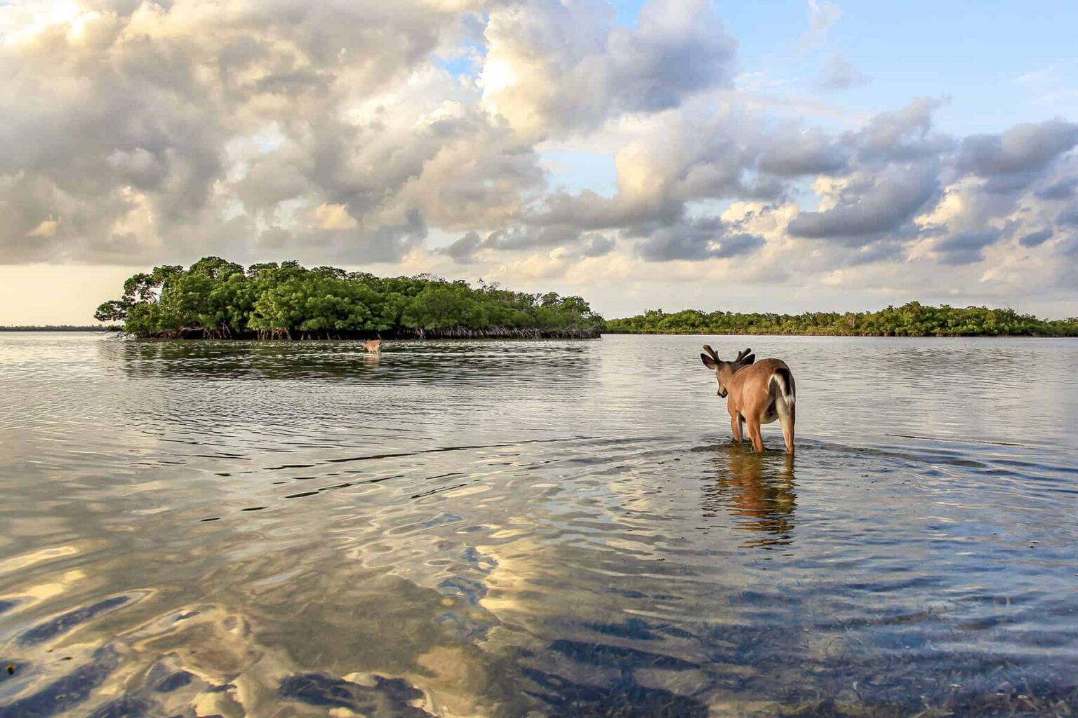 Key deer, the smallest deer species native to North America, primarily feed on red mangroves that grow in the Keys. The U.S. Fish and Wildlife Service considers the ungulates endangered due to the loss of habitat from development, domestication from humans feeding them, and changes to the fire regime in the area.