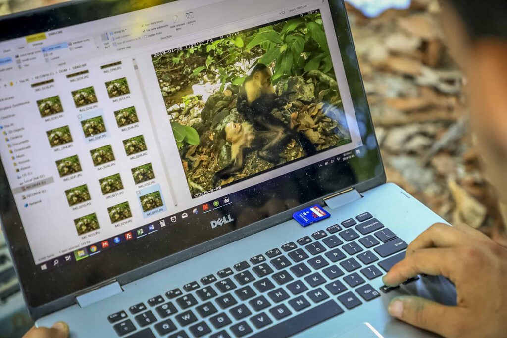 Goldsborough spent her doctoral studies focusing on the drivers of the tool use tradition on Jicarón, which, like howler kidnapping, is limited to males. For that work, her team set up 80 wildlife cameras across Jicarón Island, which is less than one square mile. Combing through the footage, she made a shocking discovery: a white-faced capuchin monkey was carrying around an infant Coiba Island howler monkey (Alouatta coibensis coibensis).