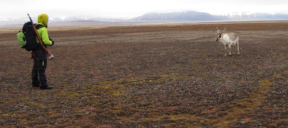 But for now, Le Moullec feels positive about the recovery of these “quite fascinating animals” and their prospects for future survival. As she and others like Martin Kristiansen, pictured above, hiked transects with their rifles on their backs, she was amazed to walk more than a mile without seeing a single tiny polar desert plant (the area in the photo is less barren). But, still saw a reindeer and calf every four miles or so.
