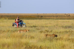 Over the course of this work, she was on the scene to watch two brother cheetahs in the act of pinning an uninterested and unenthusiastic female to the ground, making a sound called “churring” to plead their mating case. She also witnessed a sable antelope (Hippotragus niger) mother burst from the bush in time to ram a young adult cheetah off its calf.