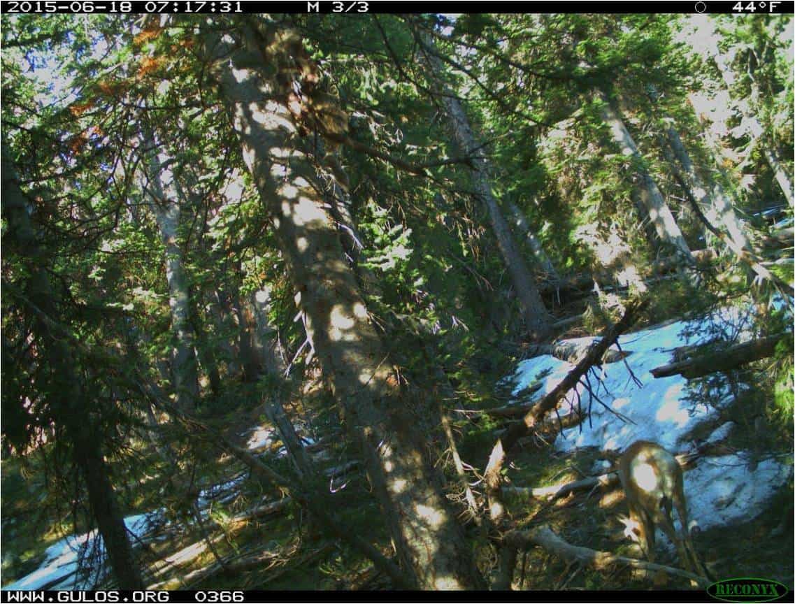 Bjornlie said that the researchers wouldn’t normally associate pronghorn (Antilocapra americana), seen in the lower right of the image, with the same kinds of habitats as wolverines. “With all of these camera projects, every day is like Christmas, you never know what you’re going to get a hold of,” she said.