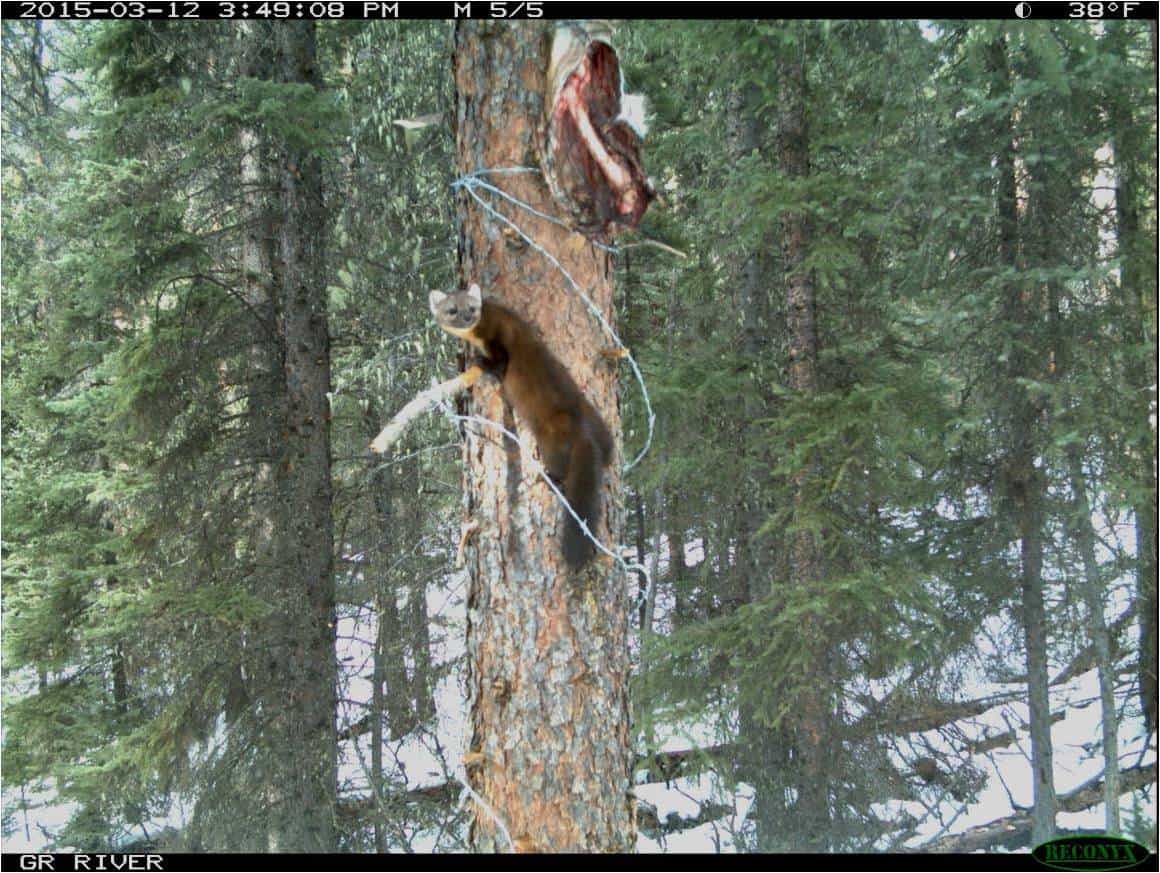 Some of the carcasses were hung up in the tree at the top of the camera’s range. Bjornlie said this was strategically done so that the focus of the shots would be on potential wolverines, and the cameras wouldn’t waste shots on magpies or other birds that landed on the top of the carcass and picked away at it.