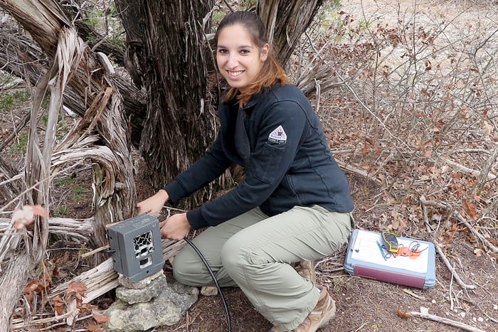 Avrin, pictured above, led a study published in Ecosphere comparing wildlife in Fort Hood with those in the Santa Cruz Mountains in California. Using camera traps, she and her collaborators tried to find out what species were in the area, how they interacted with each other, and if they changed their behavior when larger predators were around.