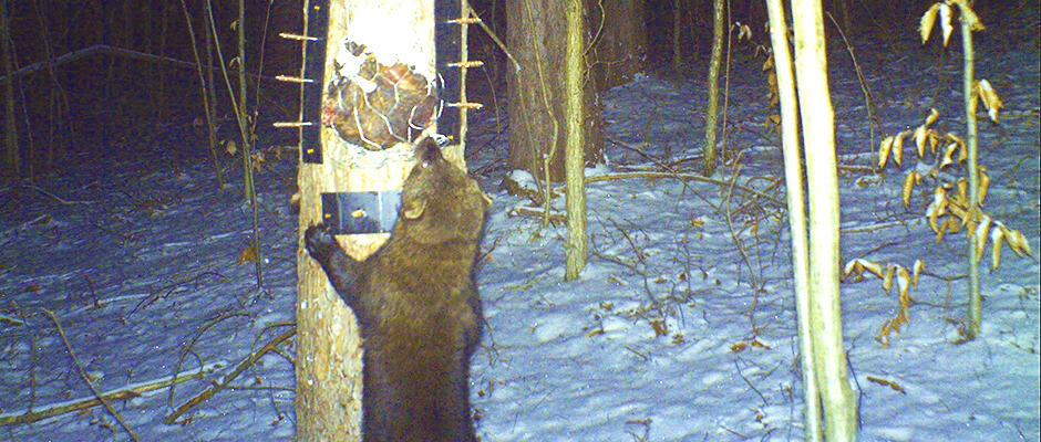 Here, a raven attacks the beaver meat bait set out for the fishers.
