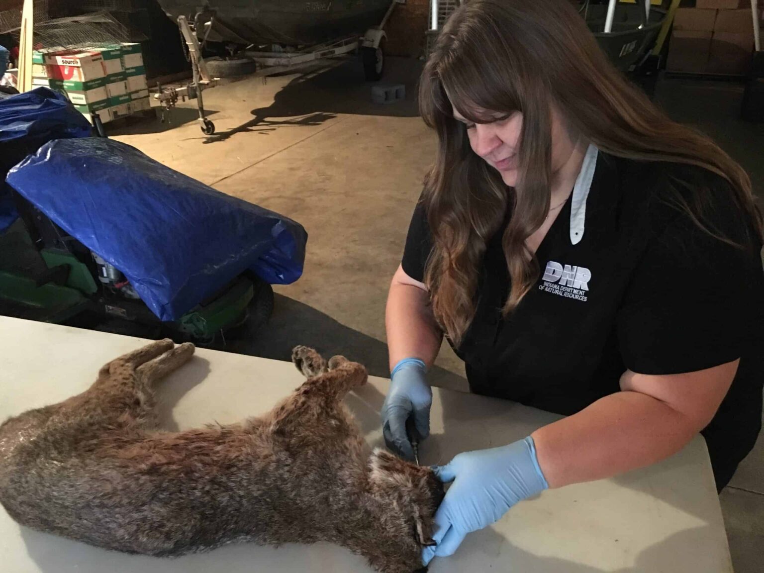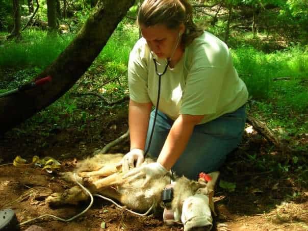 Geriann Albers checks the heart rate of a chemically immobilized coyote (Canis latrans) being tagged and collared for urban coyote research in New York. Courtesy of Geriann Albers