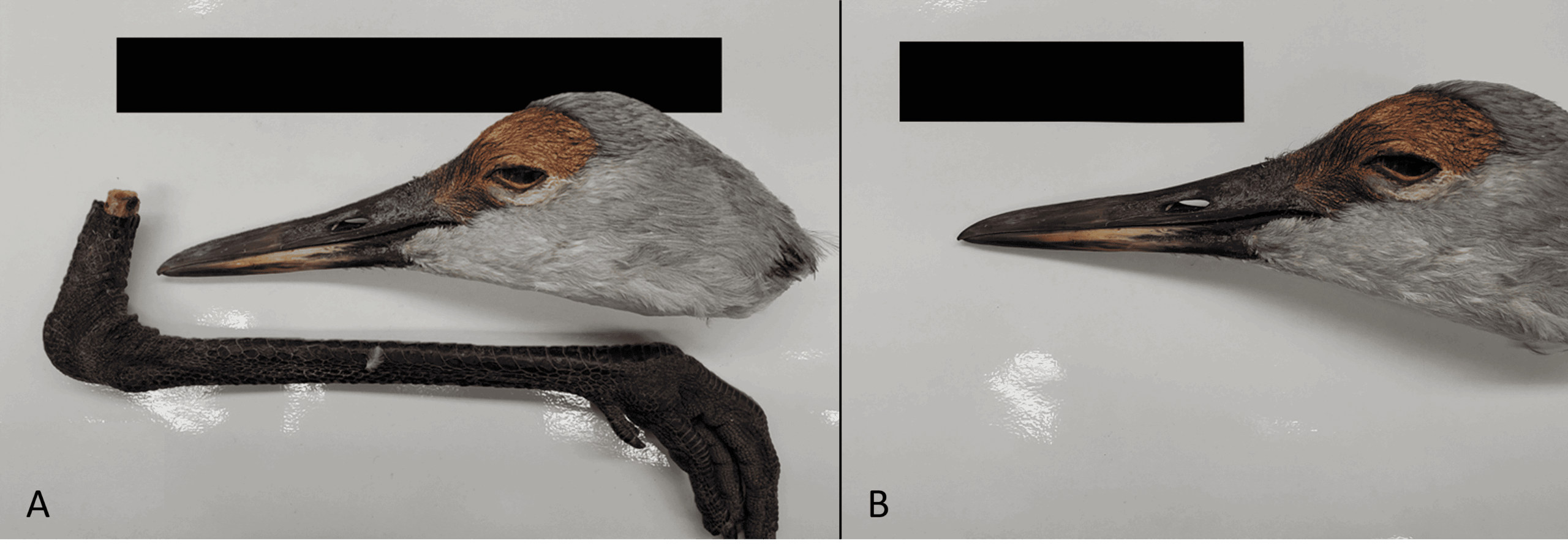 Starting in 2019, Dinges asked volunteers to mail him crane legs and bills. In the lab, he developed a way to accurately measure the size of parts of the bill and legs by taking photos of them next to an object of known length. Using computer software, he could digitally measure these parts to predict the age and subspecies of sandhill cranes, which are divided into lesser (A. c. canadensis) and greater sandhill cranes (A. c. tabida).