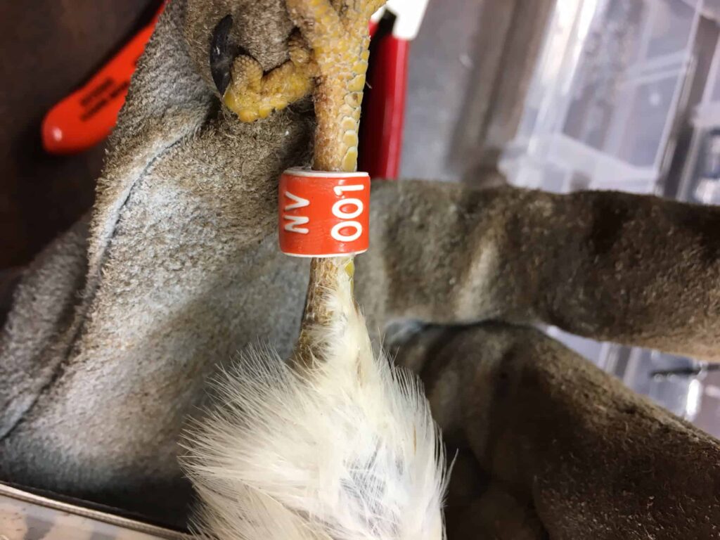 Managers gave translocated kestrels leg bands for future identification. This kestrel was the first banded for the project, captured at the Reno International Airport in Nevada. Credit: USDA Wildlife Services